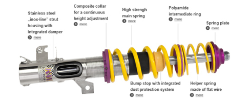 Die KW V5 Clubsport ermöglicht eine maximale oder individuelle Tieferlegung im geprüften Einstellbereich. Dank des schmutzunempfindlichen Trapezgewindes und dem Polyamid-Gewindering kann die stufenlose Tieferlegung auch nach Jahren schnell und leicht variiert werden.