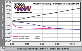 Grafische Darstellung des Verhältnisses der Dämpfergeschwindigkeit (m/s) zur Dämpfungskraft (N) bei Verstellung der Druckstufendämpfung.