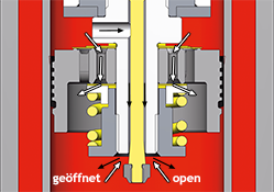 Bypasskanal der Zugstufeneinstellung ist geöffnet. Eine progressive Kennlinie und die mindestens mögliche Zugdämpfung werden erreicht. Die Bypassölmenge (schwarze Pfeile) steht dem Federventil am Kolben nicht mehr zur Verfügung und die Dämpferkräfte werden dadurch reduziert.